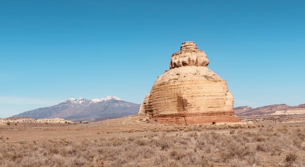 Church Rock in Utah is a 200‑foot Entrada Sandstone monolith standing alone in the wide desert valley between Monticello and Moab, right off U.S. Route 191. It’s one of those formations that feels almost placed—a solitary dome rising from an otherwise open plain, with the La Sal Mountains often snow‑tipped behind it.
